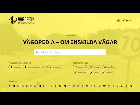 I sidhuvudet finns en lista "A-Ö" med alla de ämnen som tas upp i Vägopedia. Från listan A-Ö kommer du direkt till ämnena inom respektive bokstav.